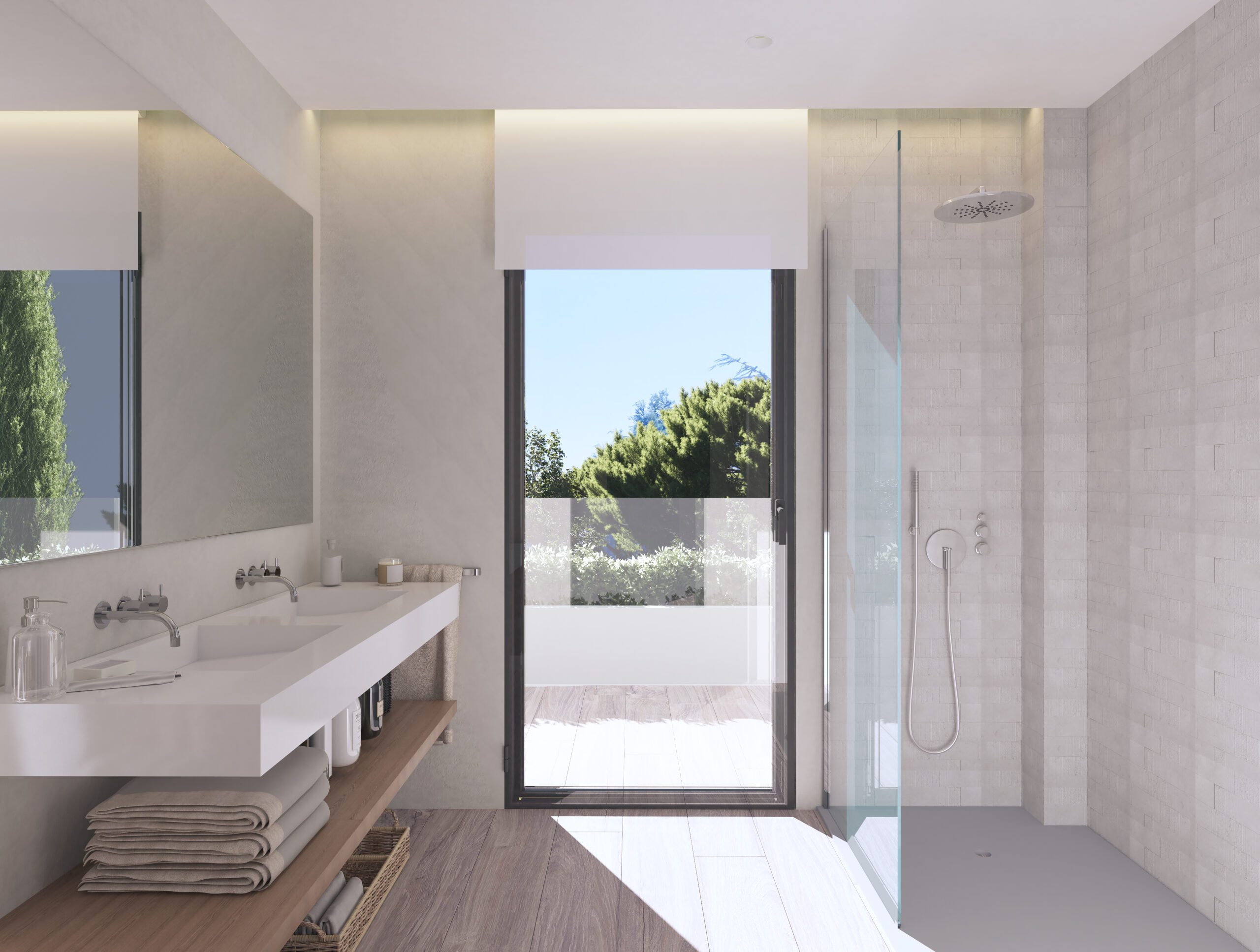 Lavabos de encimera suspendidos. Plato de ducha extraplano de resina con columna termostática. Inodoros suspendidos de doble descarga.